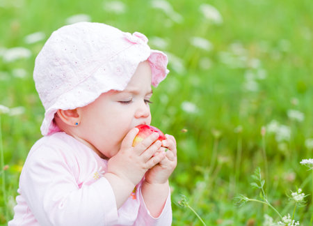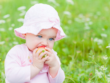 愛らしい赤ちゃんの女の子の写真がリンゴをかじる の写真素材 画像素材 Image